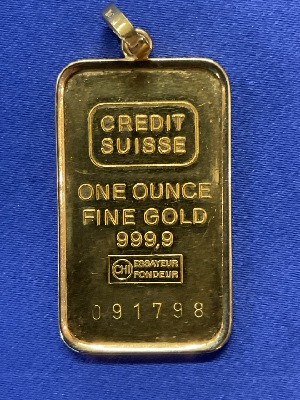 1oz. Credit Suisse .999 Gold Bullion Bar Jewelry Pendant. 18K Gold Frame. Total weight: 33.5 grams. Serial no. 091798.