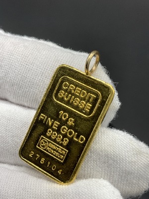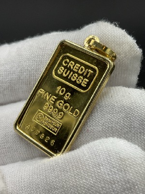 10g Credit Suisse Gold Bullion Bar Necklace Pendant. Serial no. 275104. Total weight: 10.2 grams.
