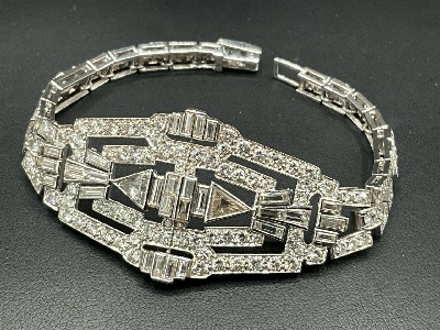 Art Deco Lady's Platinum and Diamond Bracelet. Measuring 6 3/4" length. Total Weight of Diamonds 7.27 ct Total Weight of item 32.90 grams Jewelry Appraisal Details Included Below. Appraisal Documentation Included. Provenance: Fairlawn, New Jersey Estate. Bracelet measures 7" . No hallmark or karat markings. Acid test indicates platinum. Condition: Good Diamonds: (60) Old European Cut, 1.80 ct Total Weight, H - I Color, SI Clarity, Good Cut (7) Old European Cut, 0.14 ct Total Weight, H - I Color, SI Clarity, Good Cut (58) Old European Cut, 1.74 ct Total Weight, H - I Color, SI Clarity, Good Cut (36) Old European Cut, 0.90 ct Total Weight, H - I Color, SI Clarity, Good Cut (1) Old European Cut, 0.04 ct, H - I Color, I1 Clarity, Good Cut (4) Baguette, 0.24 ct Total Weight, G - H Color, VS Clarity, Very Good Cut (2) Baguette, 0.14 ct Total Weight, G - H Color, VS Clarity, Good Cut (2) Baguette, 0.25 ct Total Weight, G - H Color, VS Clarity, Very Good Cut (8) Baguette, 0.40 ct Total Weight, G - H Color, VS Clarity, Very Good Cut (4) Baguette, 0.24 ct Total Weight, G - H Color, VS Clarity, Very Good Cut (4) Baguette, 0.36 ct Total Weight, G - H Color, VS Clarity, Very Good Cut (4) Baguette, 0.36 ct Total Weight, G - H Color, VS Clarity, Very Good Cut (1) Triangle Shape, 0.33 ct, N Color, I2 Clarity, Good Cut (1) Trillion Cut, 0.33 ct, J Color, I1 Clarity, Good Cut Total Weight of Diamonds 7.27 ct Total Weight of item 32.90 grams Appraised Value: $12,970.00