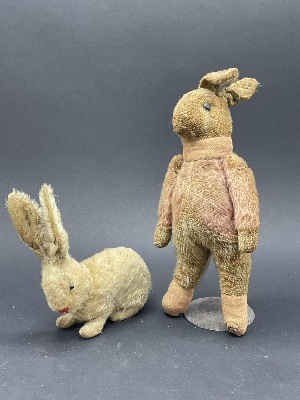 Two (2) Antique Straw Stuffed Mohair Easter Rabbits. Peter Cottontail and Small Bunny. Dimension: 7”- 10 1/2”heights