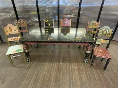 Stone House Farms Dining Room Table and Six (6) Chairs. c. 1990's Hand signed by Tracy Porter.