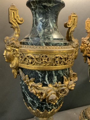 19th c. French Louis XV Bronze Ormolu and Green Marble Urn Table Lamps