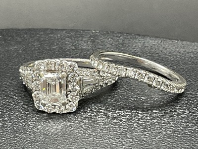 2ct Diamond Engagement Ring including 14K White Gold Diamond Engagment Ring with Emerald Cut Center Stone with Baguette and Round Side Diamonds. A 14K White Gold Matching Diamond Wedding Band.