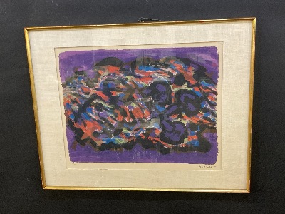 Alfred Manessier (French, 1911-1993) Titled: Les Trois Clous" 1960's Color Lithograph Print. Water staining noted in margin. Glass interior needs cleaning. Very good color. Please see photograph preview. Pencil signed by the artist lower right. Dimensions: 21” x 27” and 28 1/2” x 36”
