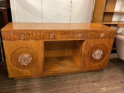 Early Mid Century Modern 1940's Lorin Jackson Designed Sideboard Cabinet. Sliding glass doors at center with two blind doors on each side with oversized carved lucite floral pulls. Lined cutlery drawers. Overall good. Wear noted. Please see photograph preview. Dimensions: 34 1/2"" X 70" X 21 1/2"