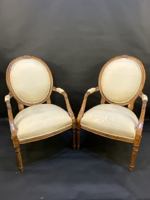 Pair of Armchairs Louis XV Style by Grange Furniture. Chair frames and wood in excellent sturdy condition. Seating upholstery is stained and needs replacement or cleaning.. Signed. Dimensions: 43” x 25 1/2” x 29”