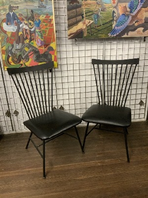 A Pair, Wrought Iron Mid Century Modern Spindle Back Chairs. Dimensions: 39 1/2” x 17” x 18”
