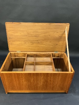 Nordisk Andels Eksport Danish Modern Teakwood Storage Chest. Fine quality trunk with sliding tray. Signed at base. Made in Denmark. Dimensions: 18” x 36” x 17 1/2”