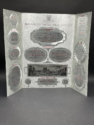 Rare Silver Restaurant De La Tour D’Argent “Silver Tower” Menu. France. Dimensions: 15” x 10” Closed 15” x 20” Open