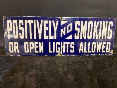 Vintage Cobalt Blue Enameled “Positively No Smoking or Open Lights Allowed” Sign. Dimensions: 7” x 20”