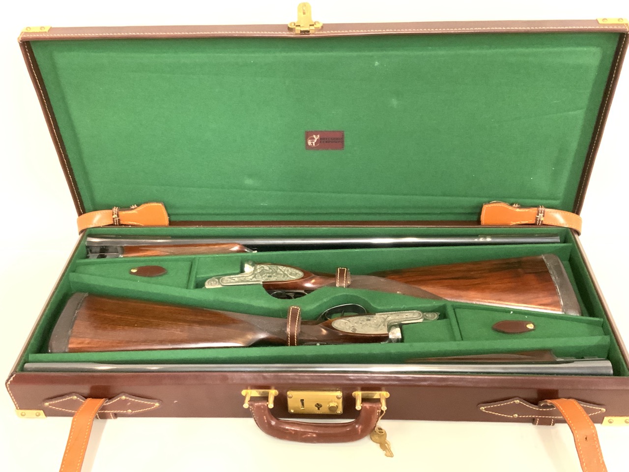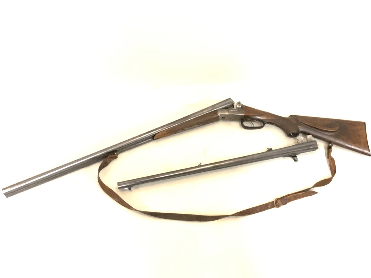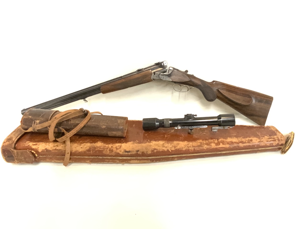 Barrel length 65cm with front set trigger and sliding safety. Highly ornate hunt scene decoration and checkering to stock.