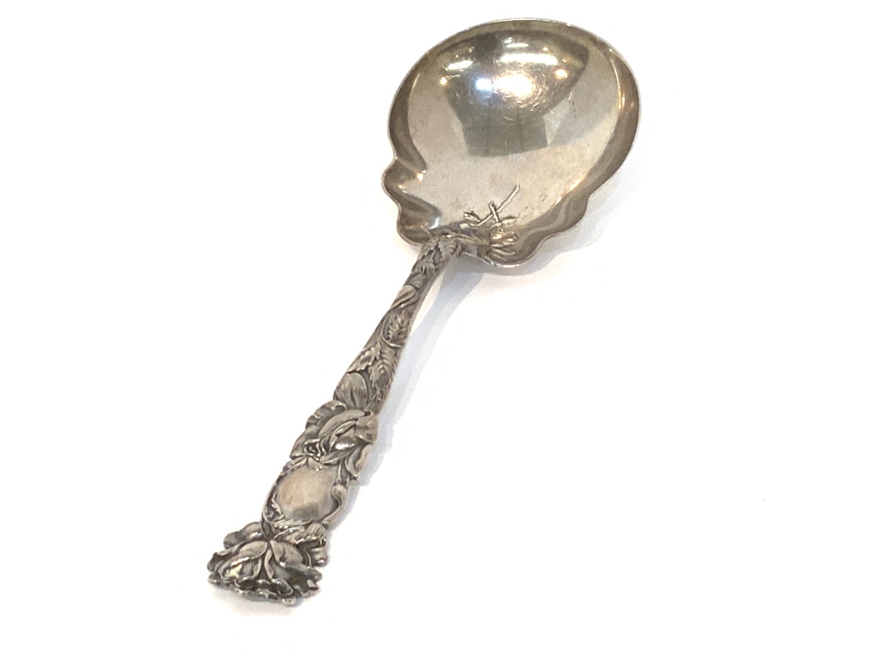 Alvin sterling silver heavy repousse serving spoon with roses. Dimension: 9" length Total weight: 4.1 avg. oz. Double stamped.