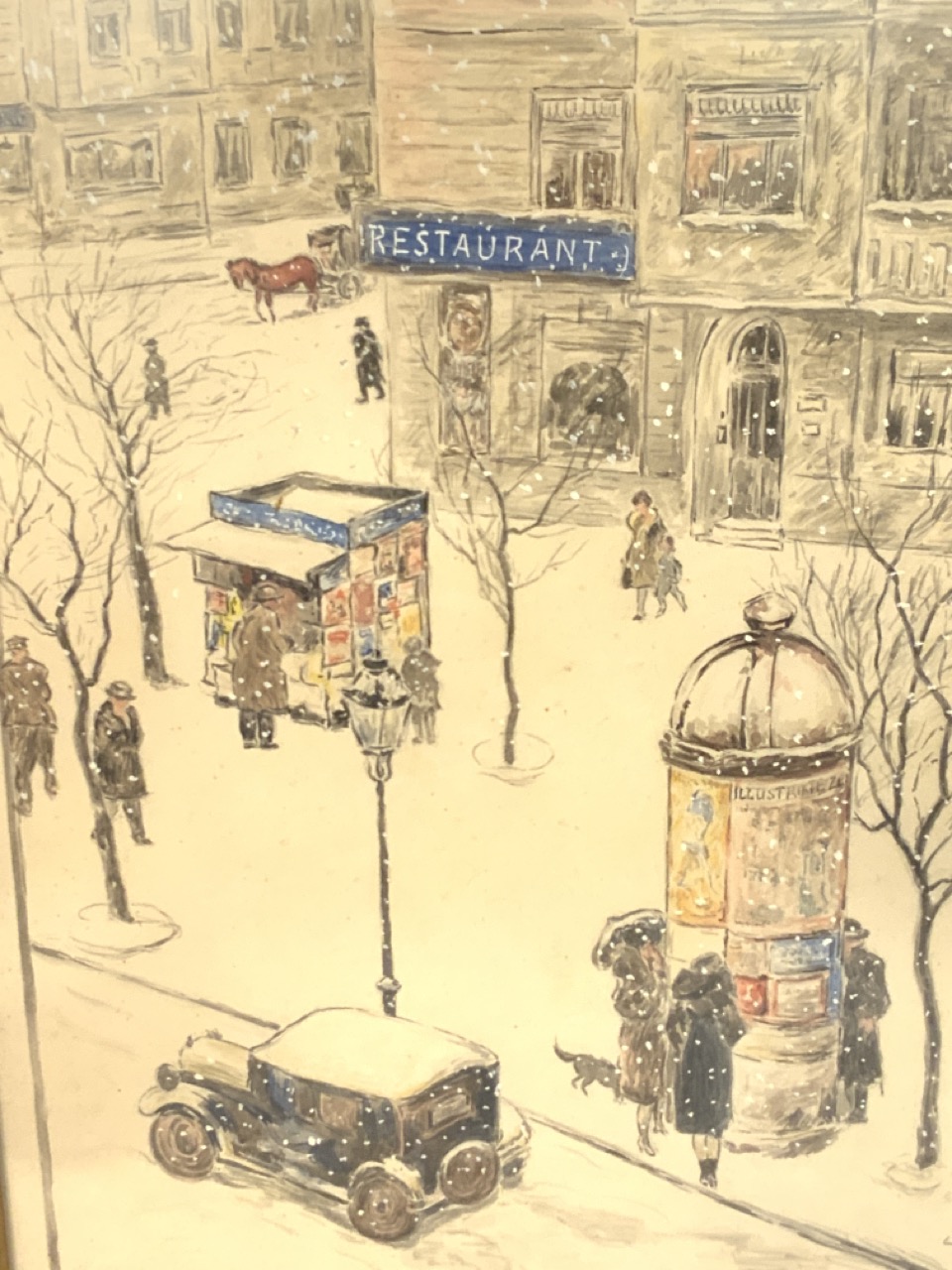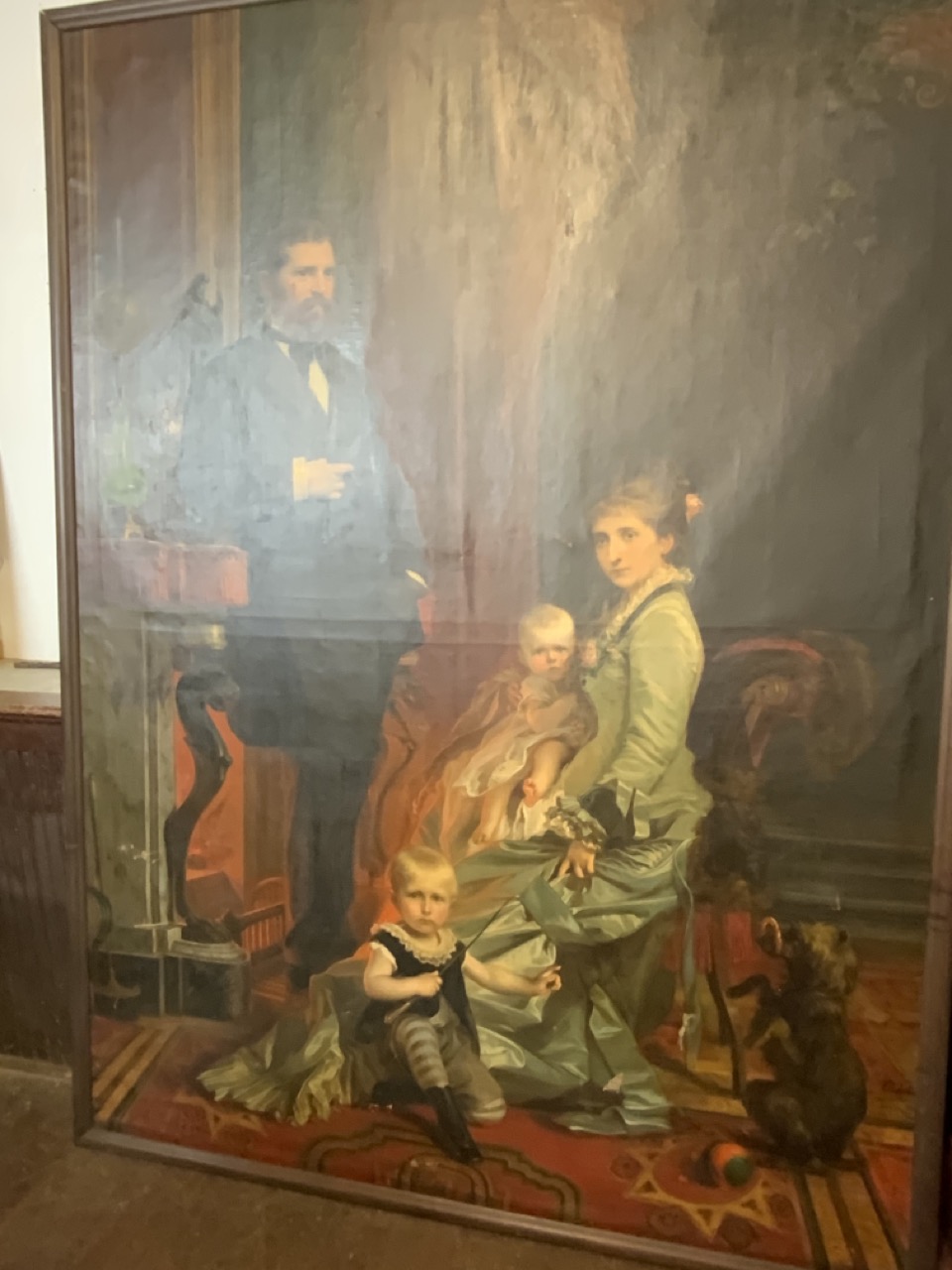 Cesare Dies (Italian,1830-1884)German Official with family in Italy c.1878.An interior family portrait scene with family in parlor with fireplace and dog.Signed lower right and signed on reverse and dated 1878 at Roma Via Babuino 144Dimensions: 95" X 69" Approx. 7ft x 5ft including frame. Slight tear to the left of the lady. Older tears seen on reverse with tape repairs. Provenance: German's airline executive's estate.