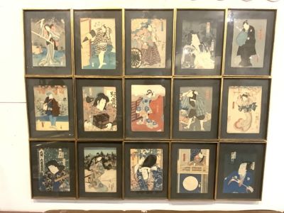 A collection of Fifteen (15) Japanese Wood block prints. All professional layed on black matting. Set in matching black lacquered frames. Various artists. Please see photograph preview or live inspection available.