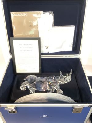 A very limited Swarovski Rhinoceros. Issued in 2008 with certificate signed by Helmut Swarovski and Anton Hirzinger. The rhinoceros has never been displayed. Includes sealed cloth, gloves, certificate, custom hard case and keys.