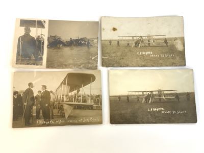 Four (4) Original postcards with real photo of Cal C.P. Rodgers and Vin Fiz airplane c.1911-1912. Rogers airplane at Hancock, NY, Coast to coast, Altantic to Pacific, Elmira NY.