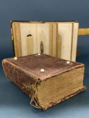 Wood, bronze and stone material.