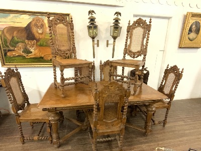 A fine French oak narrow rectangular table with leaves and seven carved chairs.