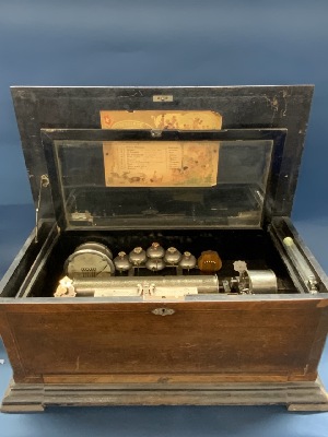 Jacot's 10 Tune Swiss Music Box.Patented 1885-1890. Switzerland. The box is most notable for the design of mallets in the form of insects with fine colored paint enameling. The box operates and plays except when handle is released charge becomes unwound and handle rapidly swings back. Repair needed. Drum covering has tear. Enamel work and mechanisms are very good. The outer casing has some finish wear. Marquetry inlay top sound.