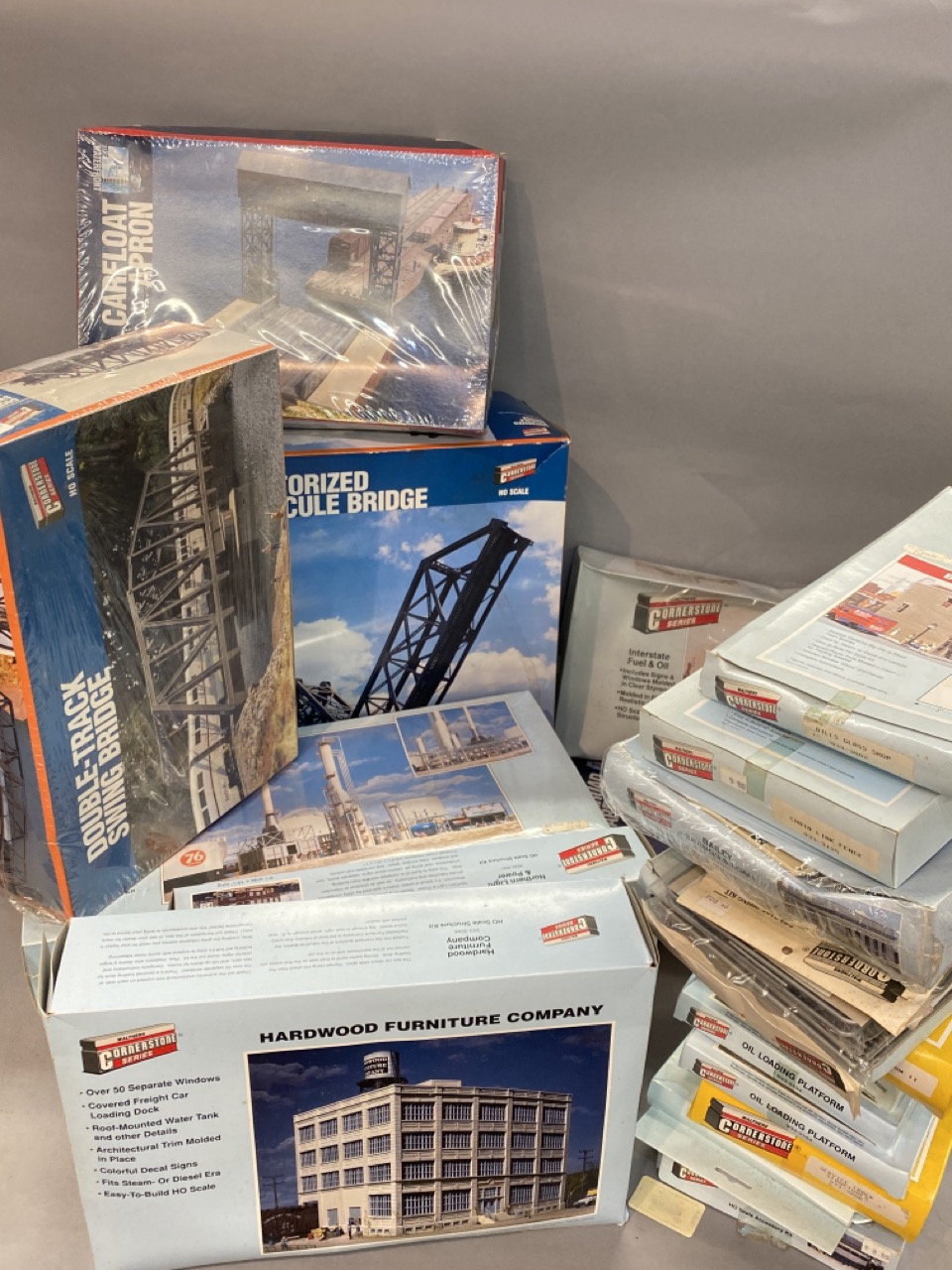 Twenty-Five walthers HO scale Model kits, mostly industrial related including hardware furniture Co., North Island refinery, iInterstate Fuel & Oill, railroad car float, car float apron, motorized bascule bridge, Double track swing bridge allied rail rebuilders and more.