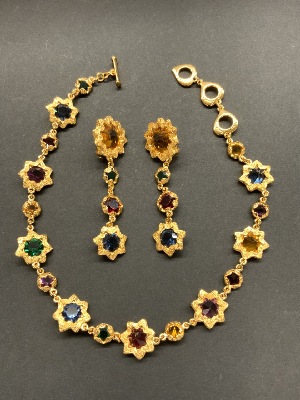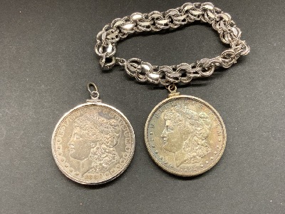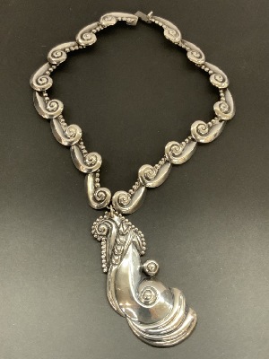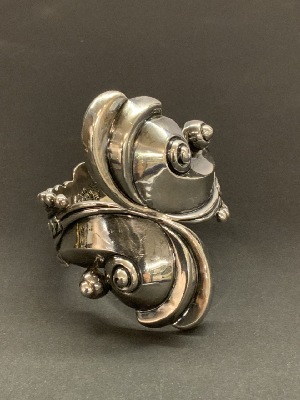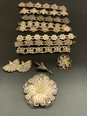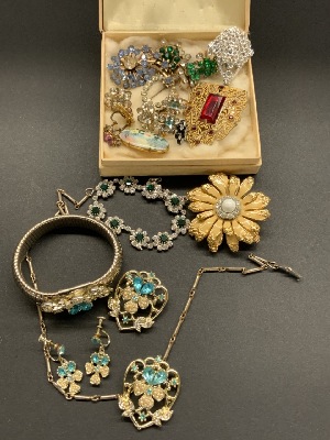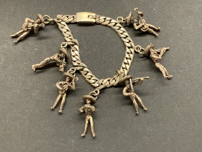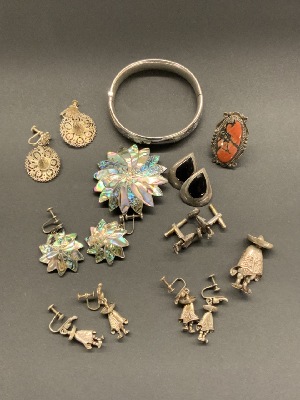 Compiled estate jewelry. Sterling silver Mexican with Taxco. D.F. Mexican signed cufflinks, two pairs of screw back earrings and pin. LCM abalone brooch and earring set 2”d. Bangle bracelet, onyx earrings, coral ring and sombrero earrings as seen in photograph preview.