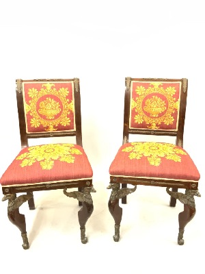 A pair of bronze ormulu mounted first period French Empire chairs. C. 1810. A finely reupholstered pair with bronze mounted spread wing eagle legs.