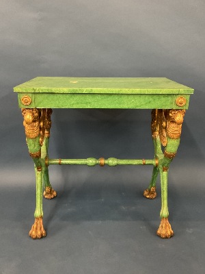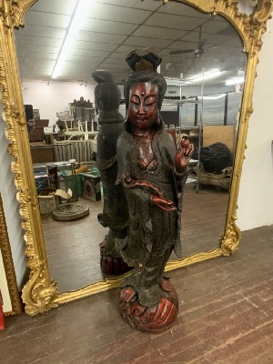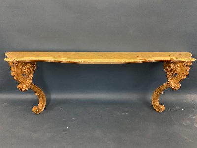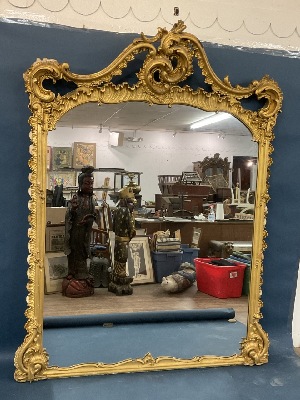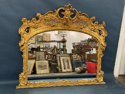 American carved gilt wood frame and gesso arched overmantel mirror, Baroque pierced crest with putti and fruit garland. Now converted to headboard. Matching cornice lot number 171