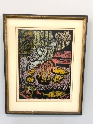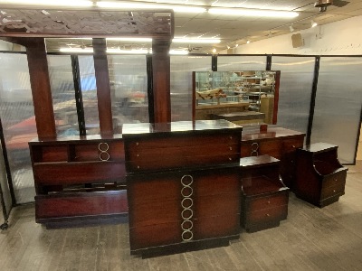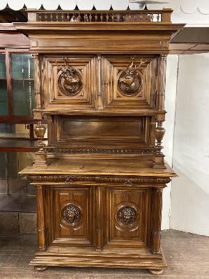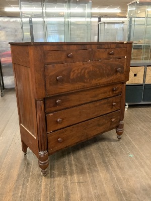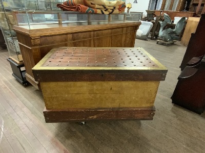 An antique carpenter's chest. Large oversize with brass reinforcement. Studded top. A brass plaque centered at top readls E.A. Foster Ridgefield, CT Interior is filled with drawers an slots to house woodworking tooks, chisels, drills, woodplanes etc. A very impressive chest. Dimensions:41 1/2” x 24 3/4” x 22 1/4”
