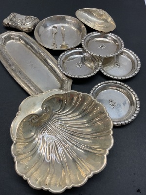 Assorted estate compiled sterling silver table wares including a Wallace shell dish, Tiffany & Co. tray etc. Match safe is German silver, everything else is sterling.