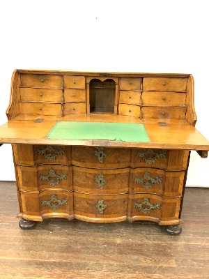 Overall very good. Bun feet have multiple repairs and damage. Inlay is very fine. All original drawers. Top cabinet completely locks all drawers when locked.