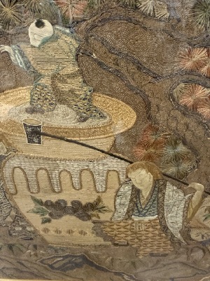Japanese Meiji period (1868-1912) embroidered silk panel, embroidered with silk yarns and metallic gold leaf wrapped threads in couching, knotting, and satin stitch with a design of two mythical Shojo, one holding a long ladle, standing around a large wine jar, a small child dancing on the wine jar cover, a large decorative folding fan above with tassel, all surrounded by butterflies, stylized clouds, bamboo, cranes, and bamboo, framed and mounted in a lucite/plexiglas case.