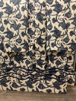 Cassandra Blue and White Paisley Valances and Curtains. 4 Box Valances and 6 Panels Total.