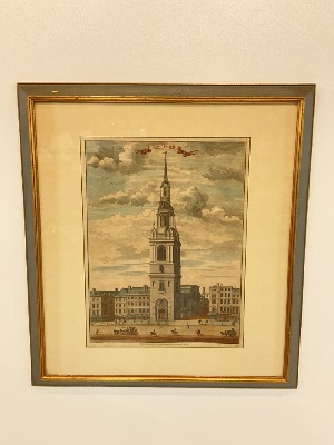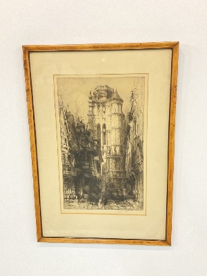 Glass removed. Artwork is loosely mounted in frame. Some staining noted. Cleaning needed. No tears. Please see photograph preview or call.