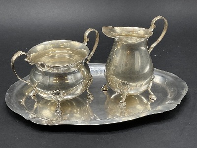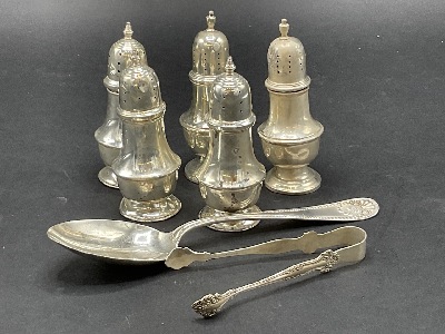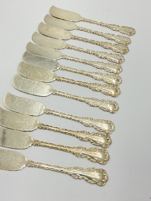 4 Large Spoons, 12 teaspoons, 2 ladles, 9 butter knives, 1 tongs, 2 servers. 51.4 toz.