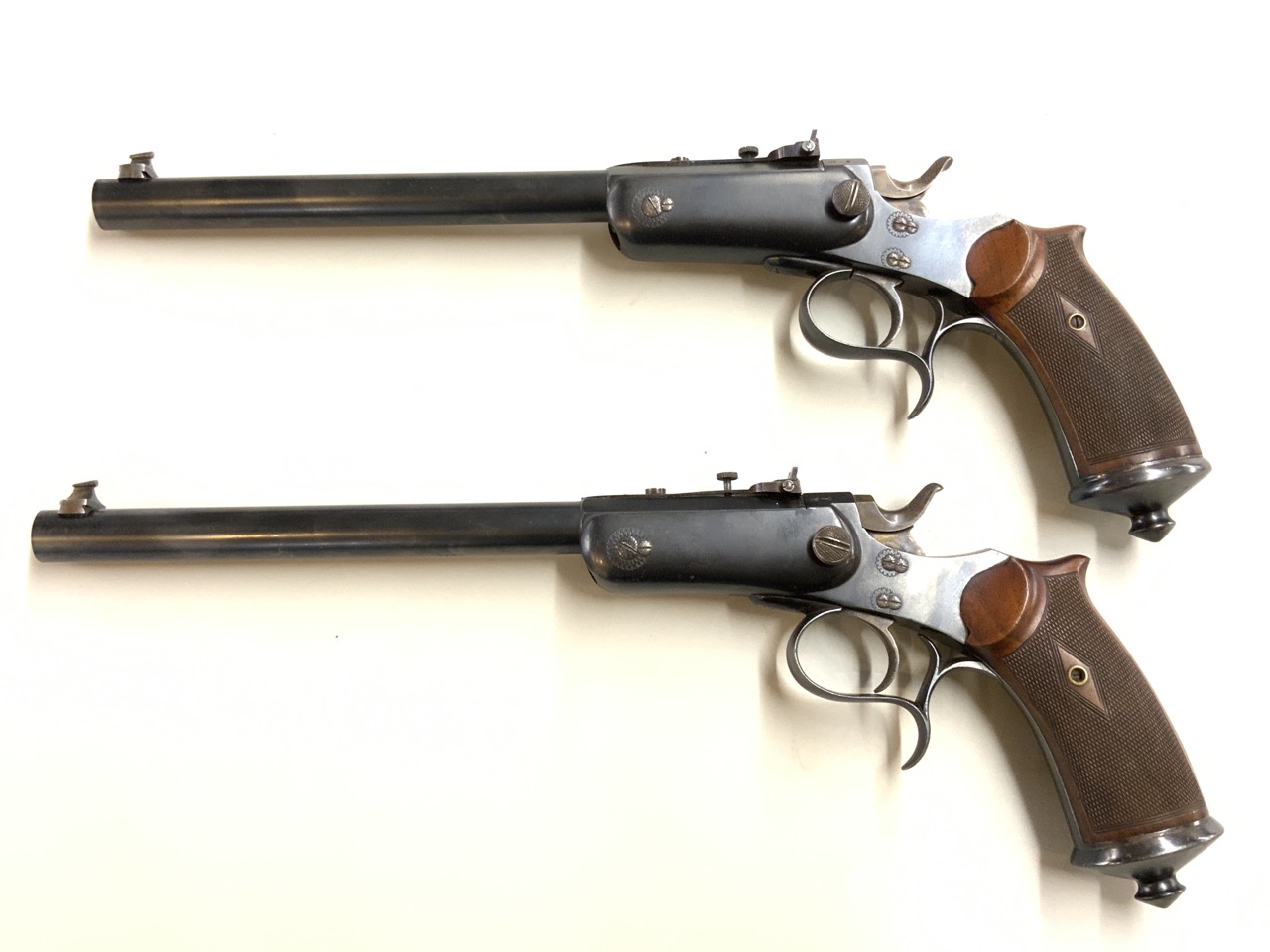 Early 20th c.. 44 cal Russian target pistols made for Le Chobert, 16r Lafayette, Paris. Serial numbers 1663 and 1664 with Belgium maker touch marks. Checkered stock. Pristine condition.