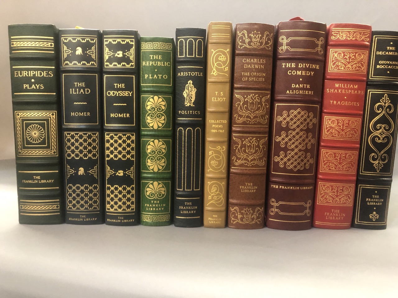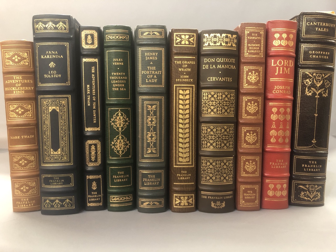 Franklin Library leather bound books. 14 pieces total. Titles include:The Scarlet Letter, Walden, The Red and the Black, Voltaire, Waverly, The Age Of Innocence, The Sound And The Fury, Balzac, A Farewell To Arms, The Return Of The Native, Tess of the Day Urbervilles, The Confessions of Saint Augustine, Tom Jones and Basic Works.