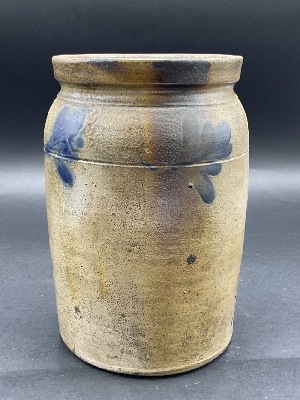 Antique cobalt blue decorated stoneware crock. Dimensions: 9” x 5 1/2”