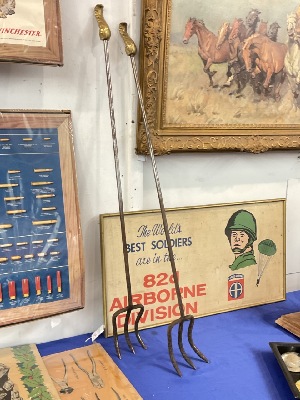 Hand Wrought Iron with brass three prong fireplace forks. Dimensions: 43" X 4 1/2"