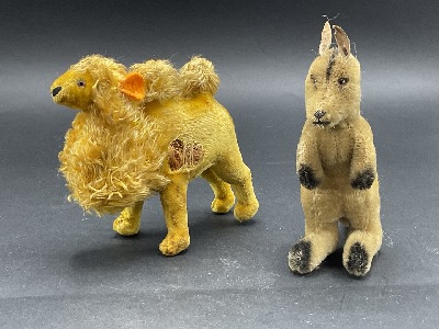 Two (2) Early Mohair stuffed straw animals. Kangeroo and Camel. Probably Steiff. Camel has wear. Dimensions: 5 1/2" X 6" X 2" and 6" X 4 1/2" X 2"