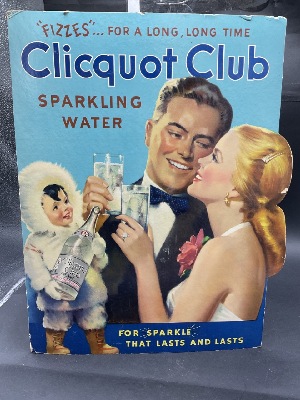 Clicquot Club 1930's Carboard Easel Back Seltzer Soda Advertising Sign.Clicquot Club Vintage Cardboard Advertising Sign. "Fizzes for a long long time" Sparkling Water, c.1930's. Very nice coloring. Not displayed. Cardboard Easel Back. Dimensions: 20" X 16"