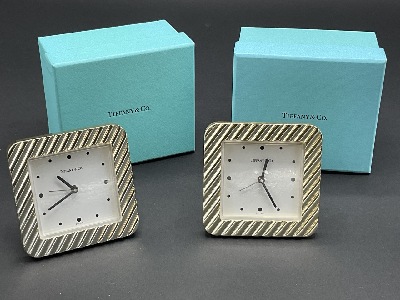 Two (2) Tiffany & Co. Swiss made travel alarm clocks. Boxes included. Dimensions: 3 1/2”